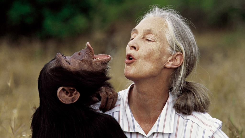 Wereldberoemd zijn de beelden waarin Goodall wordt geknuffeld door een geredde chimpansee.