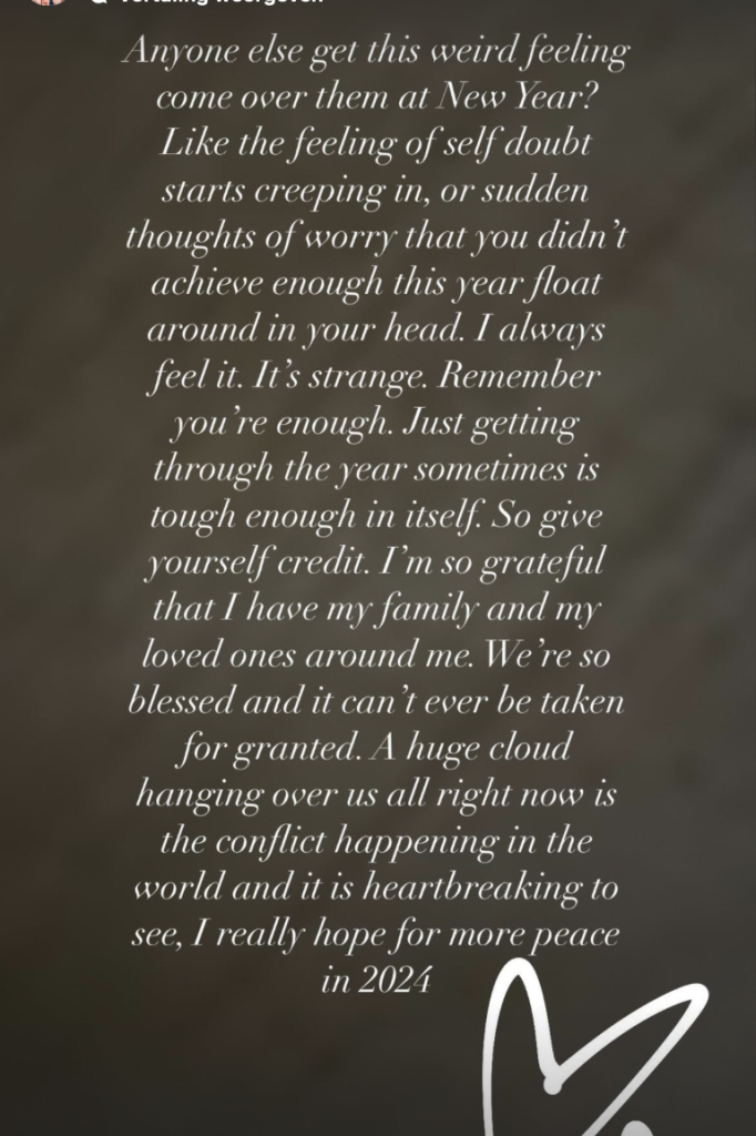 'Zijn er nog meer mensen die dit vreemde gevoel over zich heen krijgen met Nieuwjaar? Alsof het gevoel van twijfel aan jezelf begint binnen te sluipen, of plotselinge gedachten dat je dit jaar niet genoeg hebt bereikt in je hoofd rond gaan zweven. Ik voel het altijd. Het is raar', schrijft de Britse.