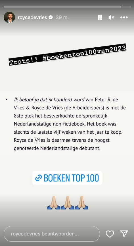'Trots!!' schrijft Royce bij een screenshot van de door boekenkoepel Stichting CPNB bekendgemaakte lijst. Ik beloof je dat ik honderd word, van Royce en zijn vader Peter R. de Vries, is het bestverkochte oorspronkelijk Nederlandstalige non-fictieboek.