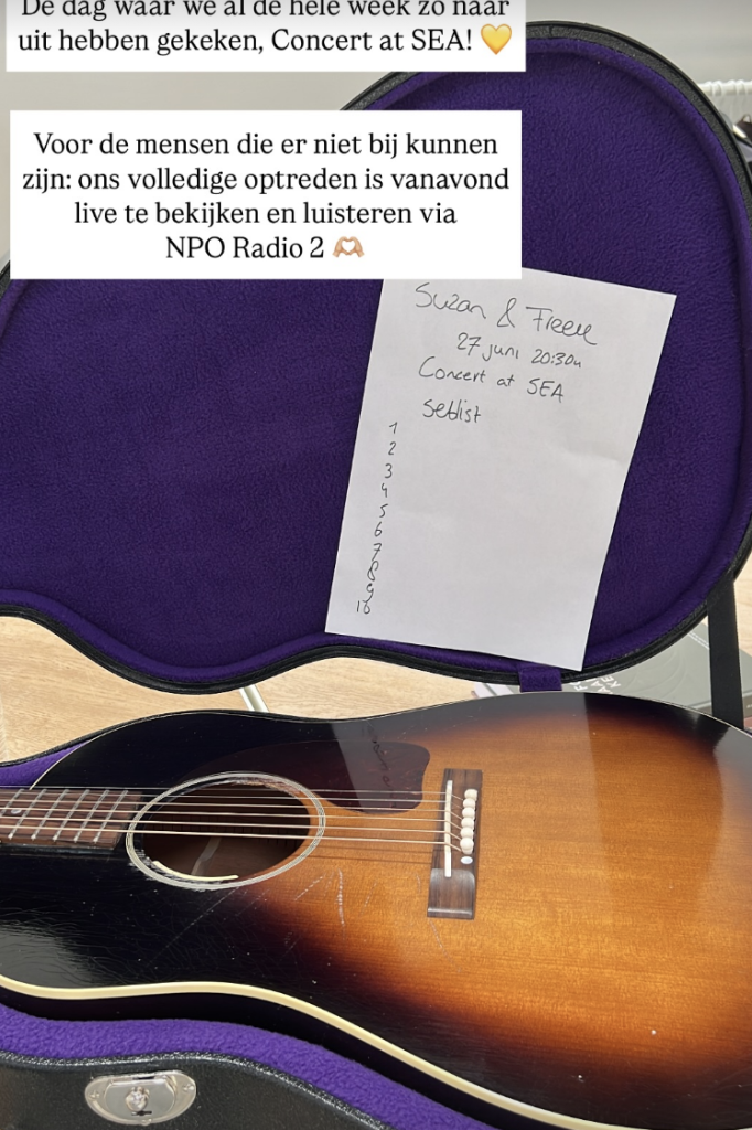 Suzan & Freek hebben zin in hun optreden vrijdag op festival Concert at SEA. 'De dag waar we al de hele week zo naar uit hebben gekeken, Concert at Sea!' schrijft het duo in hun Instagram Stories. Daar is een foto van een gitaar te zien en een blaadje met een nog lege setlist.