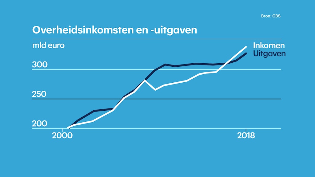 Gelukkig kwam er ook meer binnen, in totaal maar liefst 337 miljard euro. Dat is 14 miljard euro meer dan in 2017. Dat kwam voor een groot deel omdat er meer belastingen en premies binnenkwamen bij de schatkist.