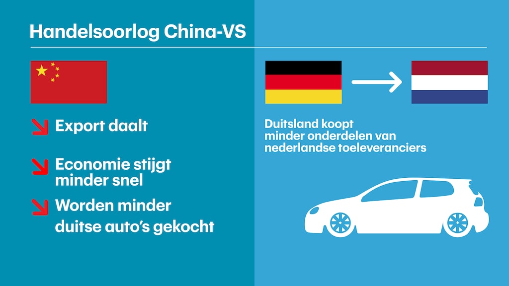 Simpel uitgelegd gaat het als volgt: door de handelsoorlog tussen China en de Verenigde Staten, exporteren de Chinezen minder. Daardoor groeit hun economie minder hard, waardoor ze minder Duitse auto's kopen. En de Duitse autobouwers op hun beurt bestellen weer minder onderdelen (zoals bijvoorbeeld veren) bij Nederlandse toeleveranciers.