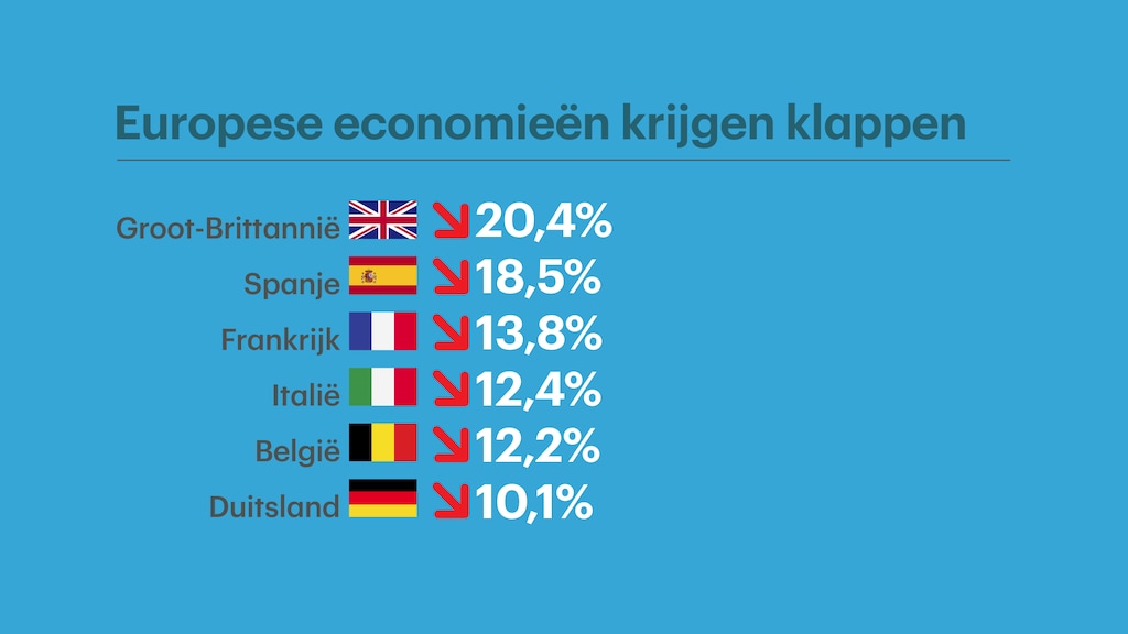 Alle grote Eurolanden deden het beter gedurende het tweede kwartaal waarbij de economie in de greep werd genomen door het coronavirus. In Duitsland was de krimp 10 procent, in Italië 12 procent, in Frankrijk 14 procent en in Spanje 18 procent. Nederland komt vrijdag met de cijfers over deze periode.