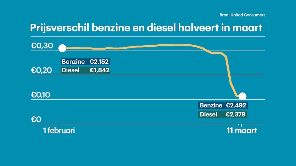 Daar kost een liter benzine inmiddels 2,50 euro. De adviesprijs voor diesel van 2,37 euro ligt daar nog maar 13 cent onder. Ter vergelijking: eind januari kostte een liter diesel nog ruim 30 cent minder dan een liter benzine.