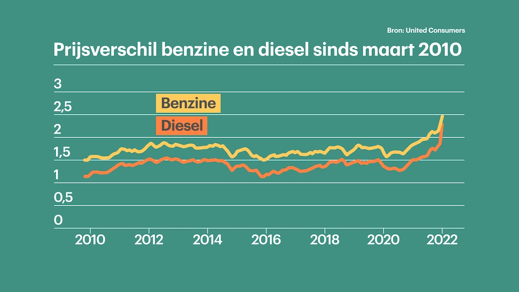 De prijs van diesel wordt dus voor een groter deel beïnvloed door wat het kost om een liter te maken. Nu de kosten daarvan flink oplopen en diesel bovendien schaarser is dan gewone benzine, is het logisch dat diesel sneller in prijs stijgt dan benzine.