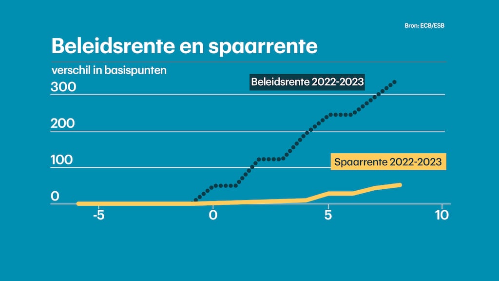 Daarbij blijkt dat de stijging van de beleidsrente van de ECB langzaam en beperkt wordt doorgevoerd in de gemiddelde spaarrente die banken geven aan hun particuliere klanten. De hypotheekrentes die zij berekenen aan hun klanten stijgen veel sneller.