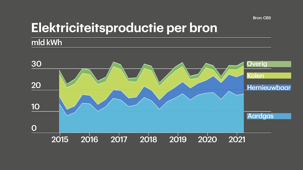 Maar de elektriciteitsproductie uit kolen is in het eerste kwartaal van 2021 vergeleken met een jaar eerder gestegen met 1,1 miljard kWh (42 procent). Volgens het CBS komt dat door een lagere kolenprijs op de wereldmarkt en dat er minder onderhoudswerkzaamheden in kolencentrales plaatsvonden.