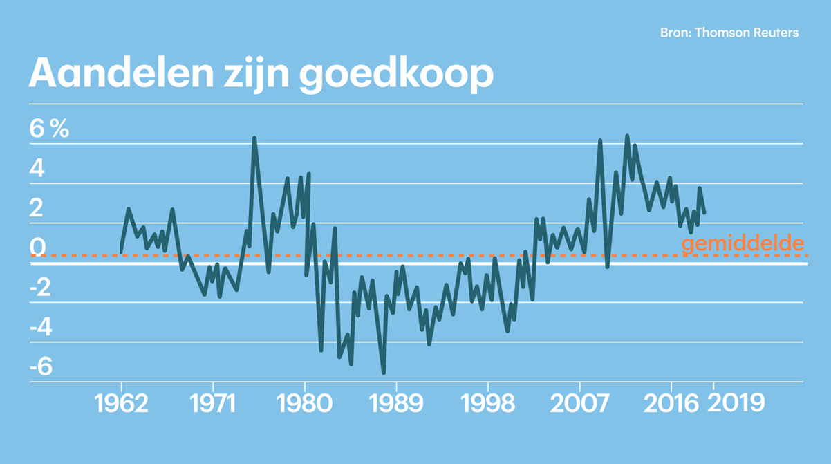 Het rendement op aandelen ten opzichte van obligaties is historisch gezien eigenlijk hoog, laat hij zien. Als het rendement op een belegging in aandelen hoger is dan het rendement op obligaties, dan zijn aandelen relatief goedkoop. Dat is nu het geval.