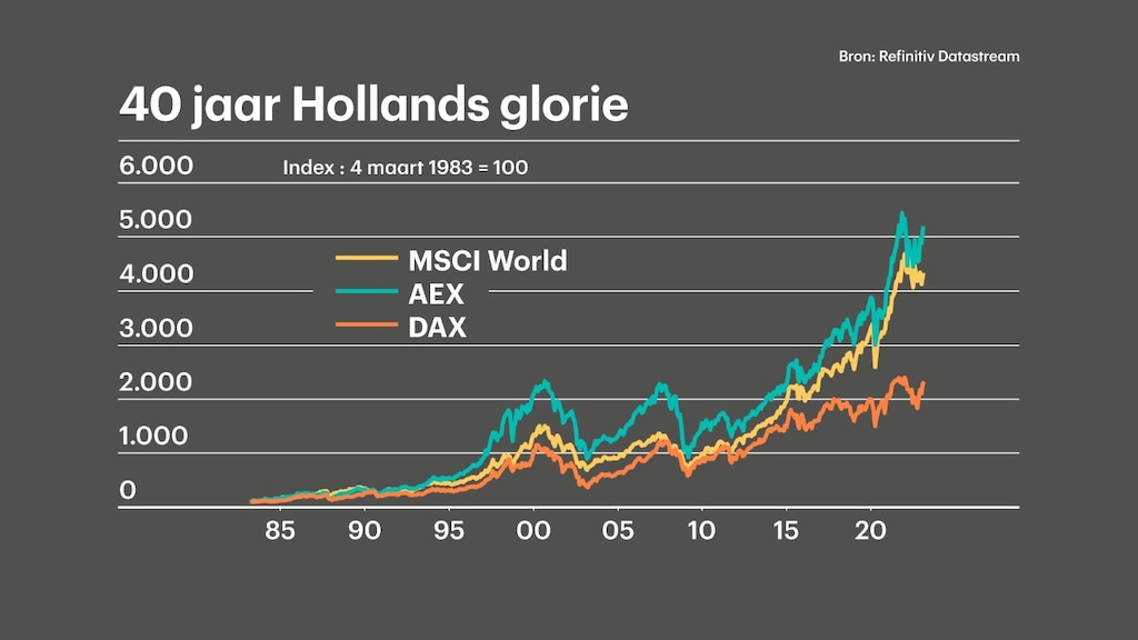 In bovenstaande grafiek zie je dat onze AEX-index het in de afgelopen 40 jaar beter deed dan veel andere beurzen. Zo zette de AEX-index de Duitse DAX aan de kant en ook de MSCI World, die de prestaties van aandelen wereldwijd meet, werd verslagen, zij het nipt.
