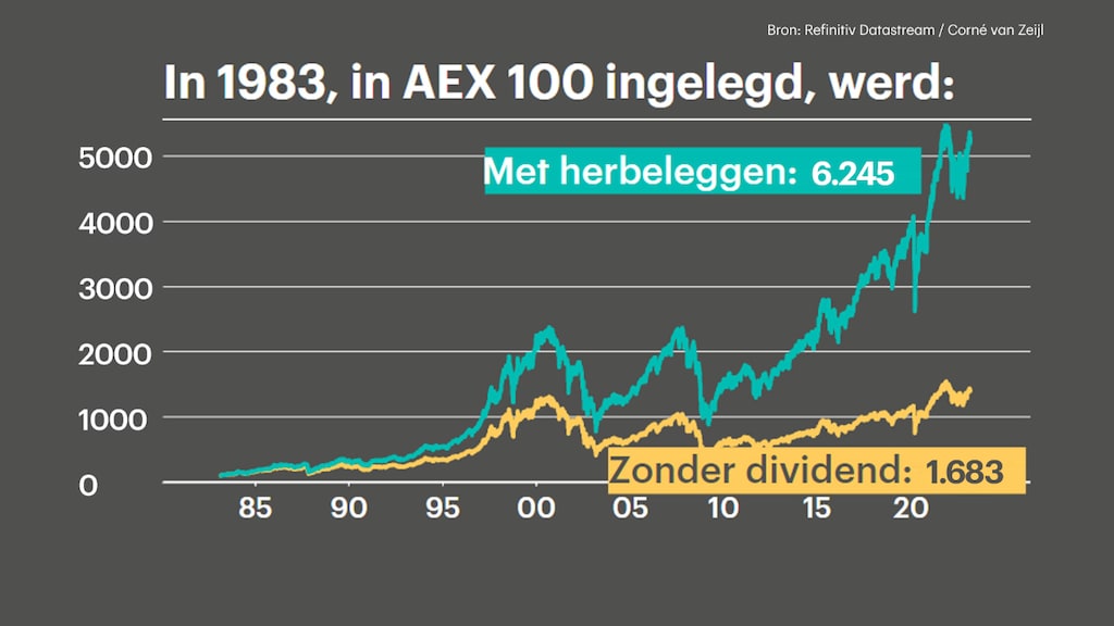 En waarschijnlijk nog wel meer. Want als je al die tijd voor de dividenden (dat is het deel van de winst dat aan aandeelhouders wordt betaald) nieuwe aandelen van AEX-fondsen had gekocht, was die 100 euro uit maart 1983 nu zo'n 6245 euro geworden.