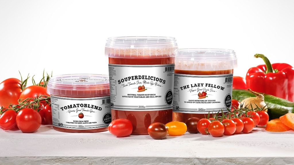 De drie producten worden in transparante cups verpakt voor de verkoop in supermarkten. We slijten onze producten ook in aluminiumzakken van vijf kilo aan grote partijen zoals cateraars, vleesverwerkers en soep- en sausproducenten. Die grote verpakkingen maken we vooral in de zomermaanden; de periode dat er wereldwijd te veel tomaten op de markt zijn."