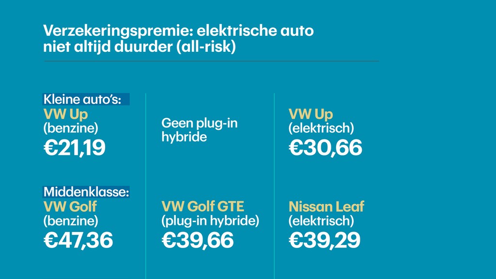 Opvallend: een verzekering voor een plug-in hybride Volkswagen Golf kost per maand minder dan een Golfje op benzine of diesel. Dat geldt ook voor een Toyota Prius (plug-in hybride) en een Nissan Leaf (volledig elektrisch).