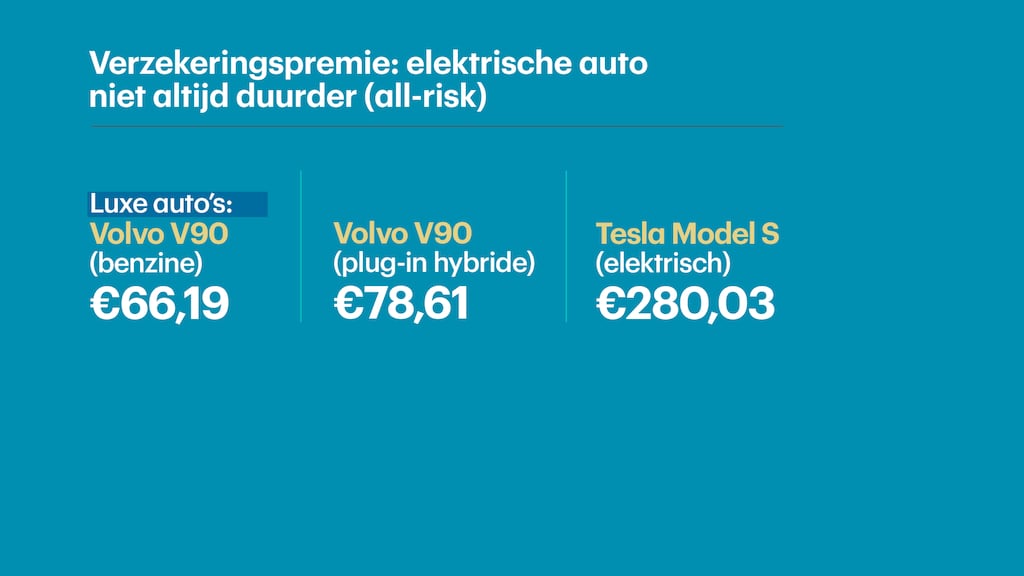Pas bij de dure auto's worden de verschillen groot. Is het verschil bij een Volvo V90 nog gering met zo'n 12 euro per maand. Het verzekeren van een Tesla Model S loopt onevenredig flink in de boeken. Dat komt omdat deze auto gewoonweg duur is. En bij een hoge cataloguswaarde hoort een hoge verzekeringspremie, legt Huyskens uit.
