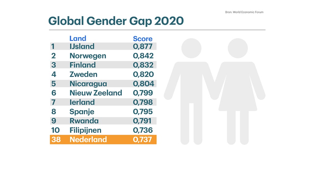 Wereldwijd is de ongelijkheidskloof voor 68,6 procent gedicht, stelt het WEF. Nederland daalt dan wel op de ranglijst, met 73,6 procent presteren we nog wel bovengemiddeld.