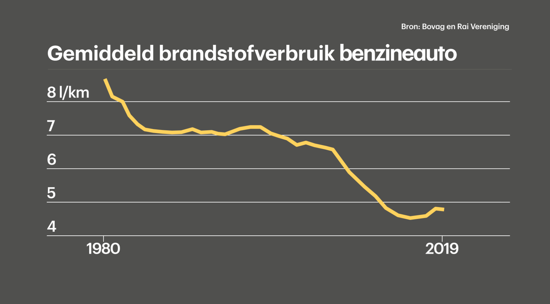 Bovendien zijn auto's aanzienlijk zuiniger geworden. Zo daalde volgens gegevens van Bovag en Rai Vereniging het gemiddelde brandstofverbruik van de 50 meest verkochte benzineauto's sinds 1980 van meer dan 8 liter per 100 kilometer, tot ruim 4,5 liter.