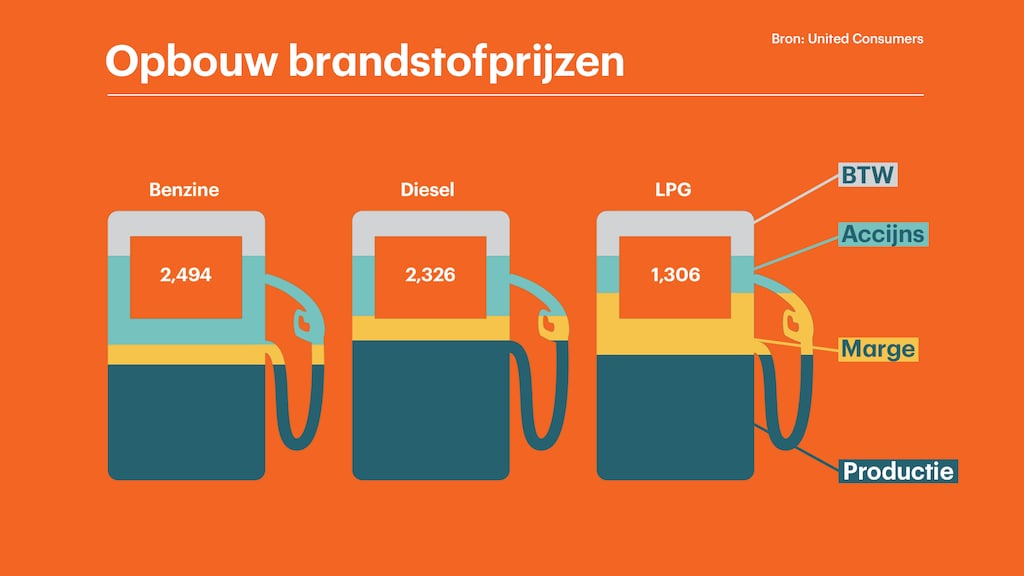 De opbouw van brandstofprijzen. BTW en accijns maken een groot deel van de (benzine)prijs uit.