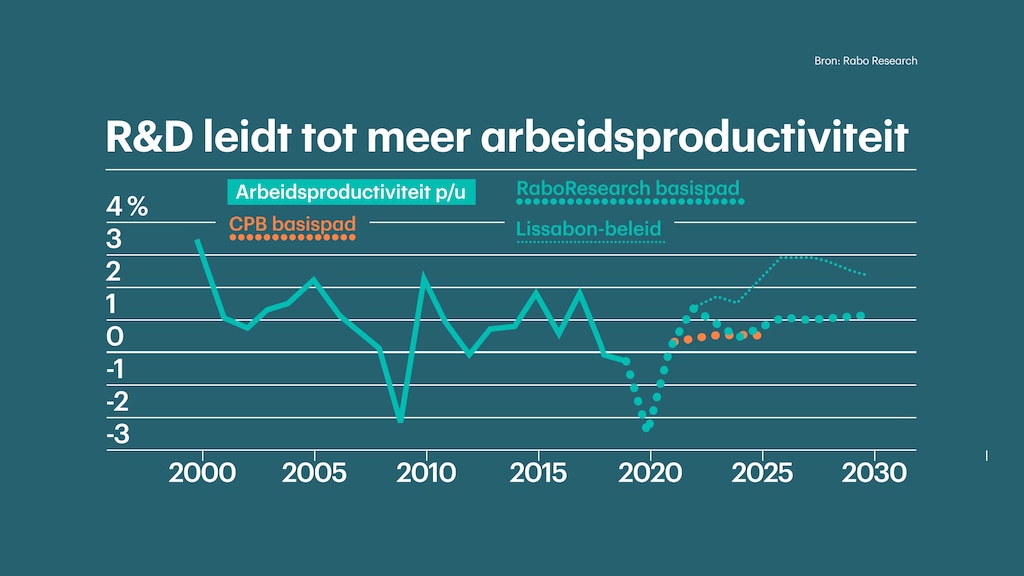 Als we ervan uitgaan dat de private sector een derde van de kosten voor zijn rekening neemt om deze doelstelling te halen, zou dit beleid de overheid tot en met 2030 ruwweg 40 miljard euro kosten. Maar in onze berekeningen levert het ook ruim 90 miljard op aan extra economische groei vanwege een sterke stijging van de arbeidsproductiviteitsgroei.