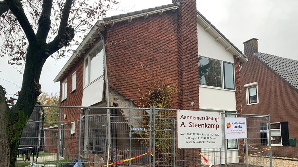 De noodmuur is inmiddels vervangen. De hele gevel was beschadigd dus de complete zijkant van het huis moest opnieuw opgemetseld worden.