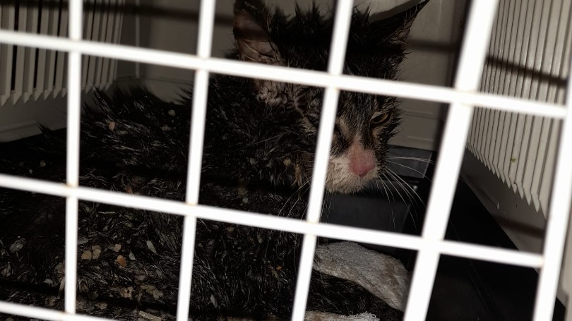 "Het lukt onze collega's de kat te bevrijden." Het diertje is meteen nagekeken door een dierenarts. "Buiten het feit dat er een vies luchtje aan hangt is de kat onderkoeld en wordt geadviseerd het dier snel verteerbare voeding te geven, op te warmen en te wassen."