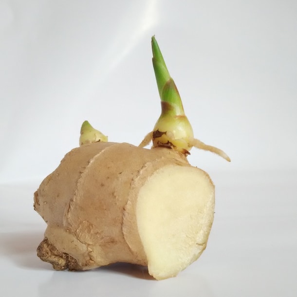 Biologische gember is het makkelijkste te stekken, want net als aardappelen wordt gember normaal gezien altijd bestraald met groeiremmers en dat betekent dat ‘ie ook bij jou thuis niet zal ontkiemen. Maar in dit geval moet de gember dus wel ontkiemen!