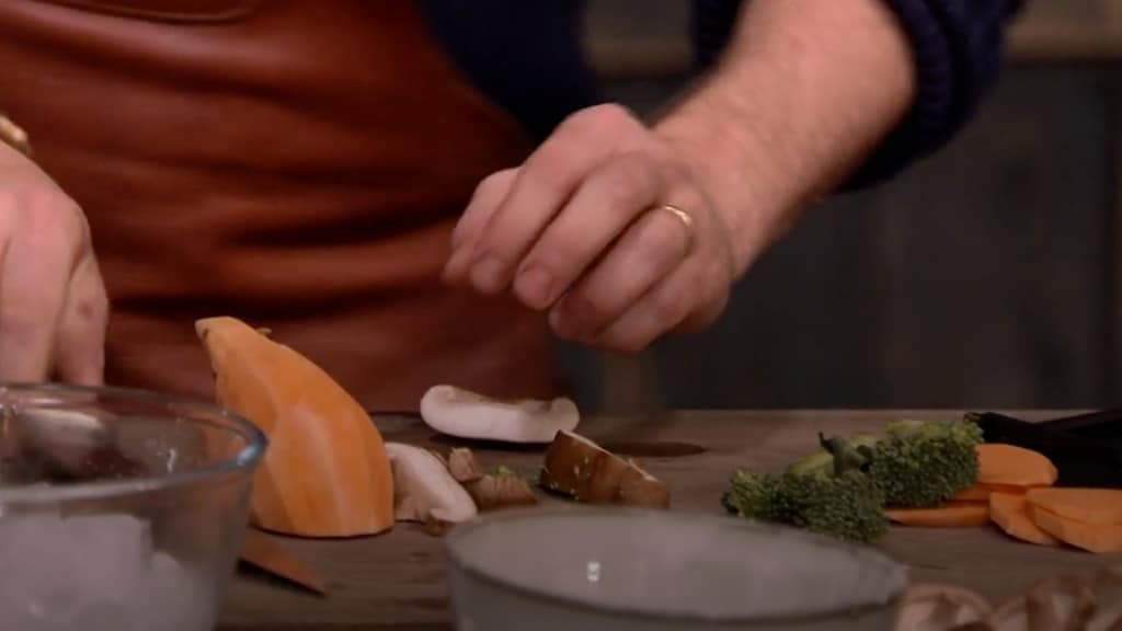 Snijd ondertussen de groentes in gelijke stukken. De zoete aardappel mag wat dunner, aangezien die langer nodig heeft om gaar te worden.