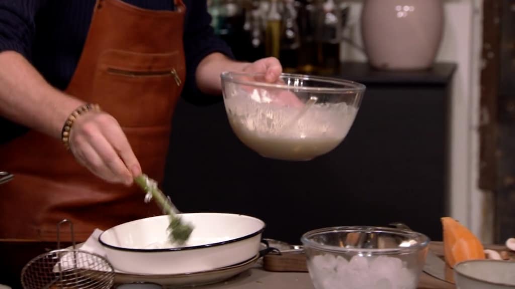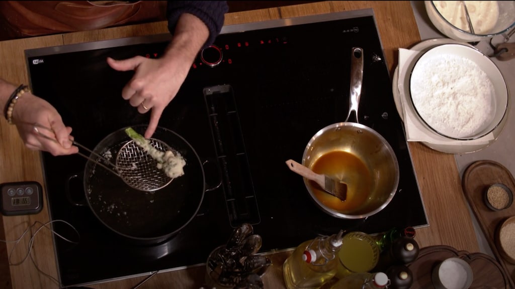 Tempura is een snel beslag wat je kunt vergelijken met een bierbeslag. Je kunt dit beslag gebruiken bij groentes, vlees of vis. In tegenstelling tot normaal, wil Hugo juist klontjes in het beslag. "Hoe meer klontjes, hoe beter" zegt hij. Niet glad of fijn mixen: de klontjes zorgen er juist voor dat het krokant wordt.