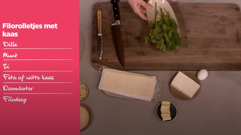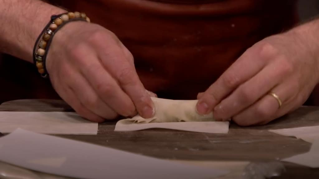Hugo maakt kleine filodeeghapjes gevuld met fetakaas en verse kruiden. Deze filorolletjes doen je misschien een beetje denken aan kaastengels.