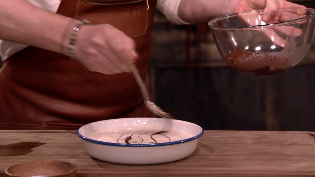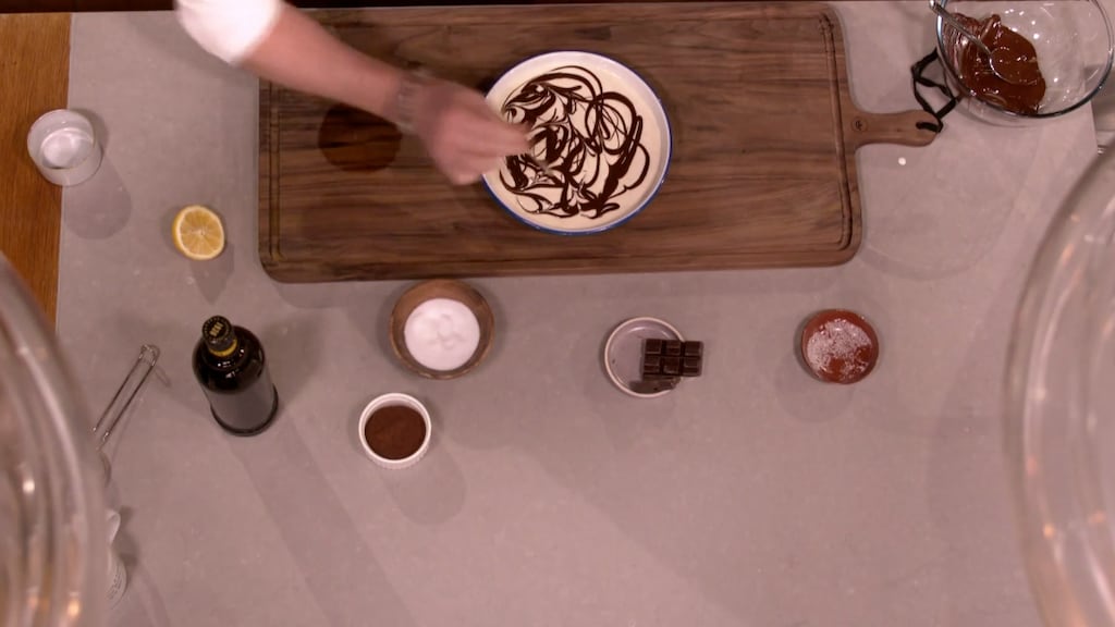 Pak de schaal met lange vingers en giet het mascarponemengsel eroverheen. Spatel het mengsel mooi uit. Sprenkel de gesmolten chocolade over de mascarpone en trek met een satéprikker zogenoemde 'swirls.'
