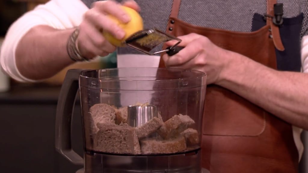 Snijd het brood in grove stukken en maal het samen met wat geraspte citroenschil in de keukenmachine. Pel en kneus een knoflookteen. Verhit daarna een goede scheut olie in een grote koekenpan. Doe de gekneusde knoflookteen eventueel met wat peper en zout erin en zet het op laag vuur. Hierin rooster je de broodkruim. Schud het geheel regelmatig om.