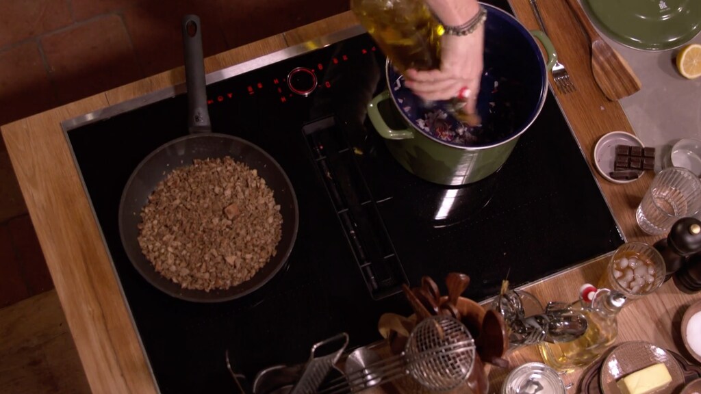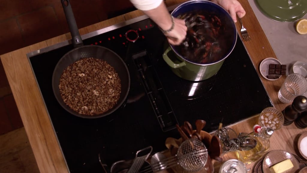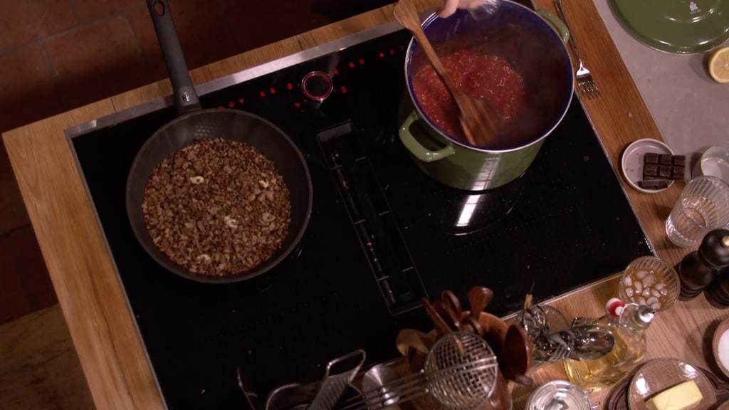 Gebruik je net als Hugo een gedroogde peper, dan kun je prima de zaadjes meebakken. De zaadjes zijn ingedroogd en maken het iets milder. Roer het geheel door en blus het af met de helft van de witte wijn.