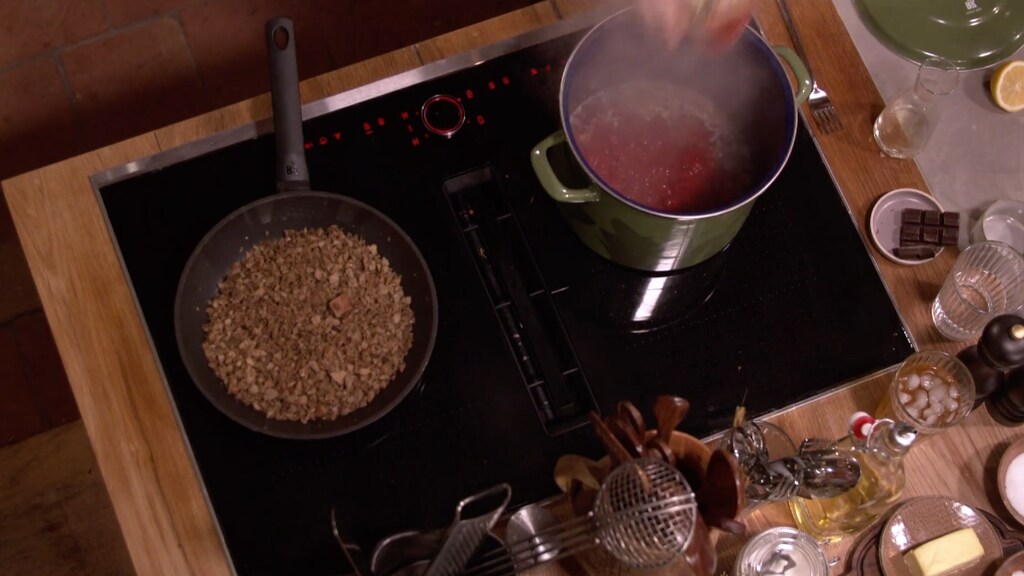 Zodra je dit hebt gedaan, mogen de tomatenblokjes inclusief wat zout en peper erbij. Laat het zo'n 10 à 15 minuten op laag vuur inkoken.