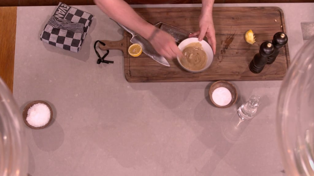 Heel eenvoudig, zo gemaakt. Het enige wat je hoeft te doen, is het volgende: doe de tahin in een schaaltje. Roer een scheut citroensap door de tahin. Rasp er knoflook boven en breng het op smaak met een zout en peper. Roer het goed door en voeg al kloppend wat water toe.