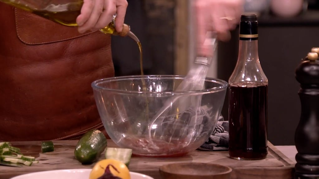 Door met de frisse salade. Begin met het aanmaken van de vinaigrette. Doe de rode wijnazijn samen met wat citroensap en een snufje zout in een mengkom. Voeg al kloppend de olijfolie toe. Snijd de komkommer over de lengte doormidden en schraap met een theelepel de zaadlijsten eruit. Snijd daarna de komkommer in halve boogjes.