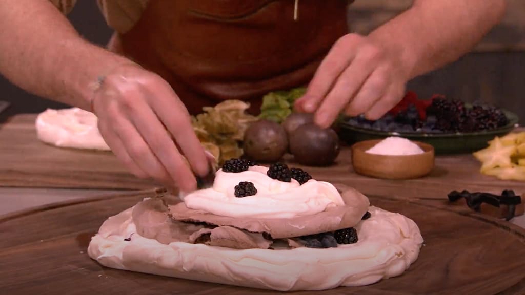 Stap 12: maak vlak voor serveren de pavlovataart op door de cirkels te stapelen met de crème en het fruit ertussen. Geen paniek als een laagje breekt, want die brosheid geeft juist definitie aan het dessert! Het is daarentegen wel mooi als je ervoor kunt zorgen dat de bovenste laag heel blijft.