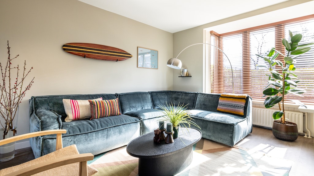 “Het surfboard boven de bank had ik ook nooit uitgekozen, maar het hangt er nog steeds, dus schijnbaar is het dan toch niet zo’n ding”, vertelt Vera. Toch hebben ze wel een paar kleine dingetjes aangepast. Vera: “In de wc hing een spiegel met heel veel ‘haar’, die noemden we ‘Mufasa’. Deze hing half voor een lichtknopje en was dus een beetje onhandig. Daarom hebben we die verhuisd naar de logeerkamer.”