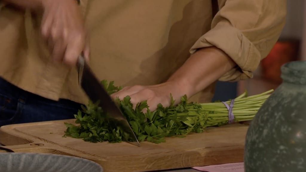 Zo, en dan echt aan de slag! Je begint met het snijden van alle groenten. Hak de peterselie klein (gebruik meteen de nieuwe snijtechniek) en de knoflook in grove stukken (plakjes en dan nog een keer halveren).