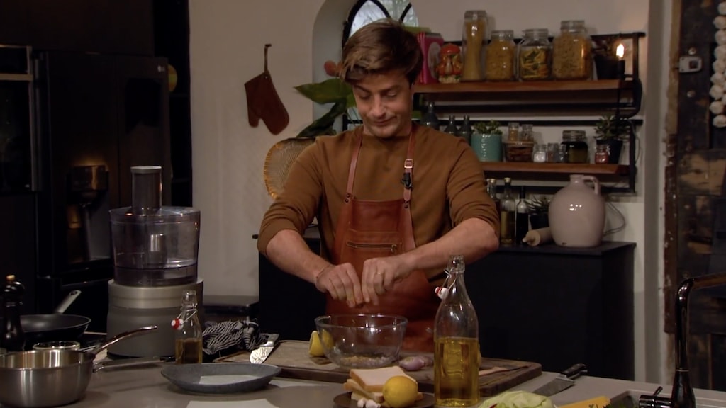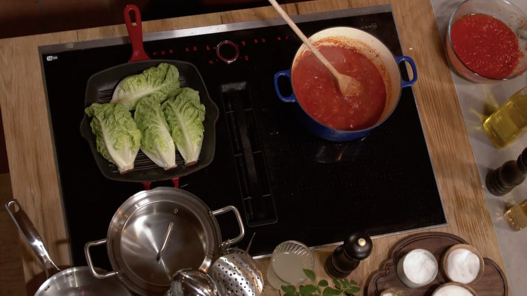 De “Little Gems” (ook wel kleine kropjes Romaine sla) worden bereid voor bij de pasta. Je kunt deze kroppen heel lekker bakken en zelfs grillen op de bbq. Vandaag grilt Hugo ze in de pan.