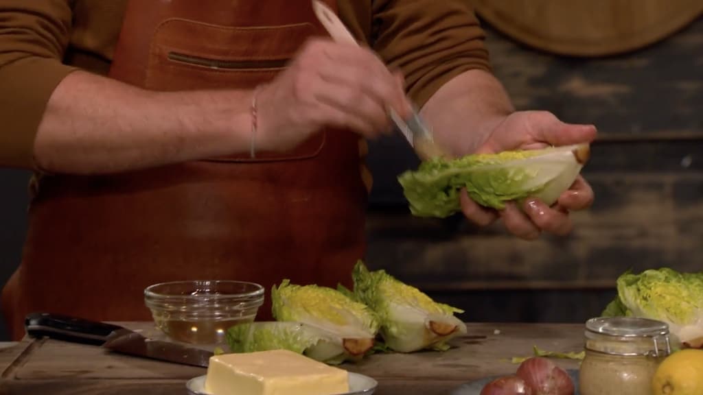 Gegrilde little gem met botervinaigrette (beurre noisette vinaigrette)