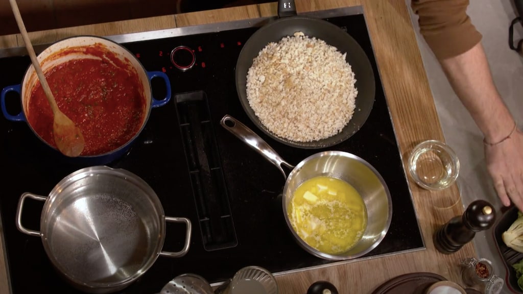 Wat doe je: pak een keukenmachine, stop er 4 sneeën wit brood in met wat geraspte citroenschil en mix het tot grove stukken. Bak dit vervolgens even in olie tot het echt mooi donkerbruin is.