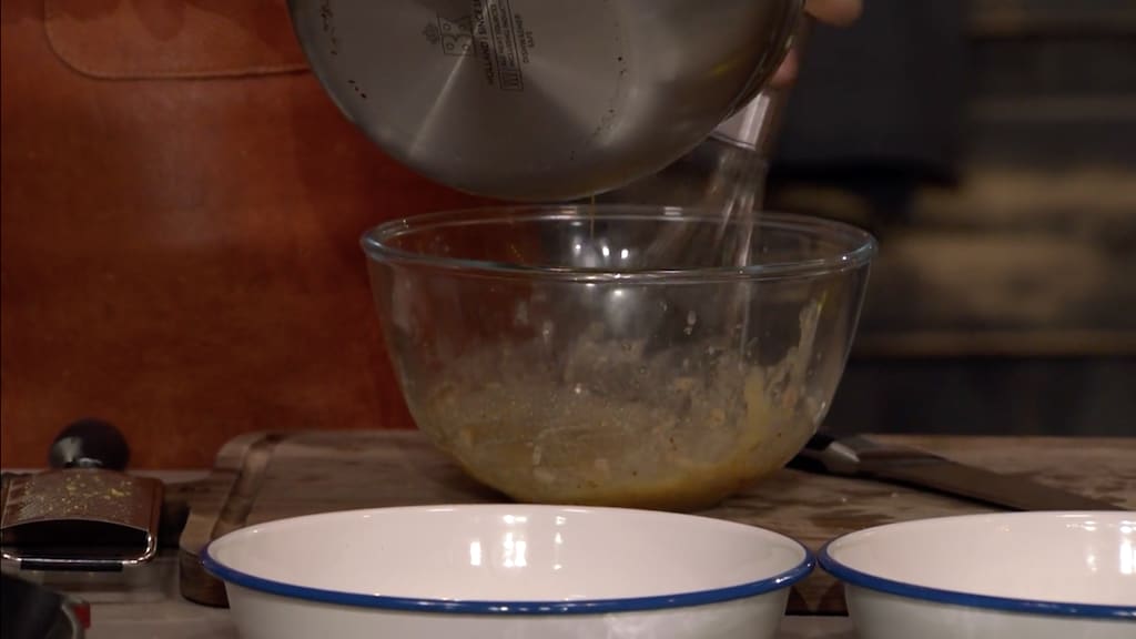 Als het goed is, zijn je geroosterde broodstukjes klaar en dan is het tijd om de dressing af te maken. De boter is gesmolten en mooi bruin. Deze voeg je -al kloppend met een garde- beetje bij beetje toe aan het mengsel wat je al had gemaakt. De dressing is nu lauwwarm en gaat natuurlijk stollen als die koud wordt. Dit is dus ook je laatste handeling. Is hij toch gaan stollen, verwarm dan alles even kort.