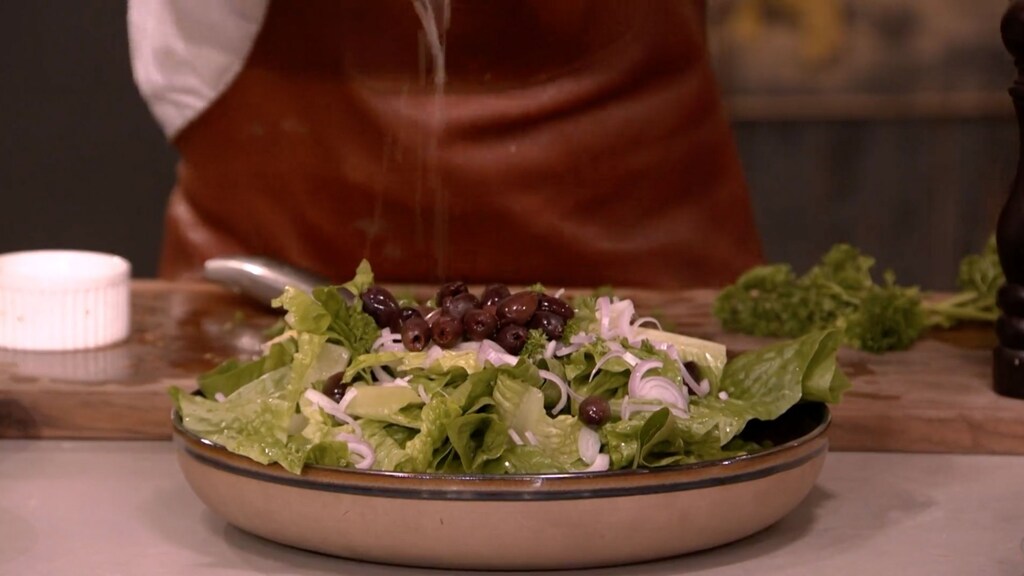 Stap 2: maak vlak voor serveren de sla, peterselie, sjalot en olijven aan met citroensap, olijfolie, zout en peper.