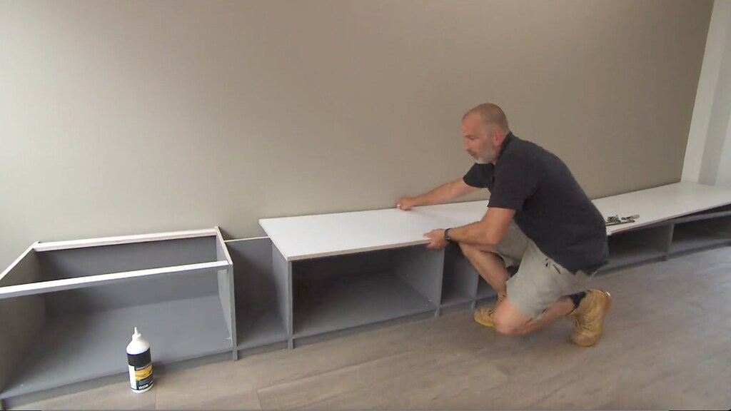 In de woonkamer wil Patrick de lange muur optimaal benutten. Hij wil een kast maken met veel opbergruimte en een zitgedeelte. Hiervoor gebruikt Patrick een 18 millimeter multiplex. Een sterk materiaal dat geschikt is om op te zitten.
