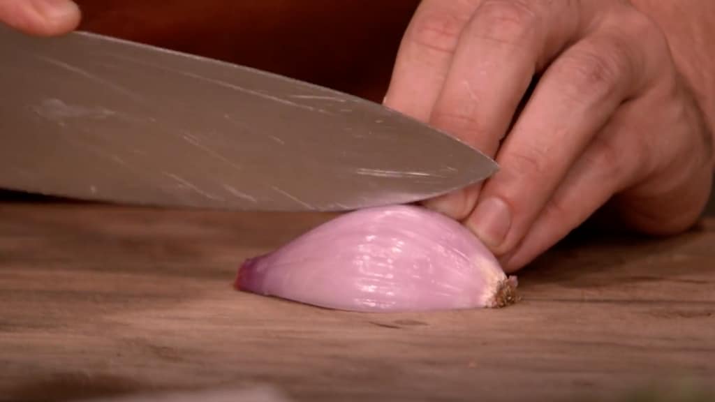 Tip: door het sjalotje met de lijnen mee en horizontaal in te snijden creëer je in 1 snijbeweging een mooi, fijngesnipperd sjalotje.