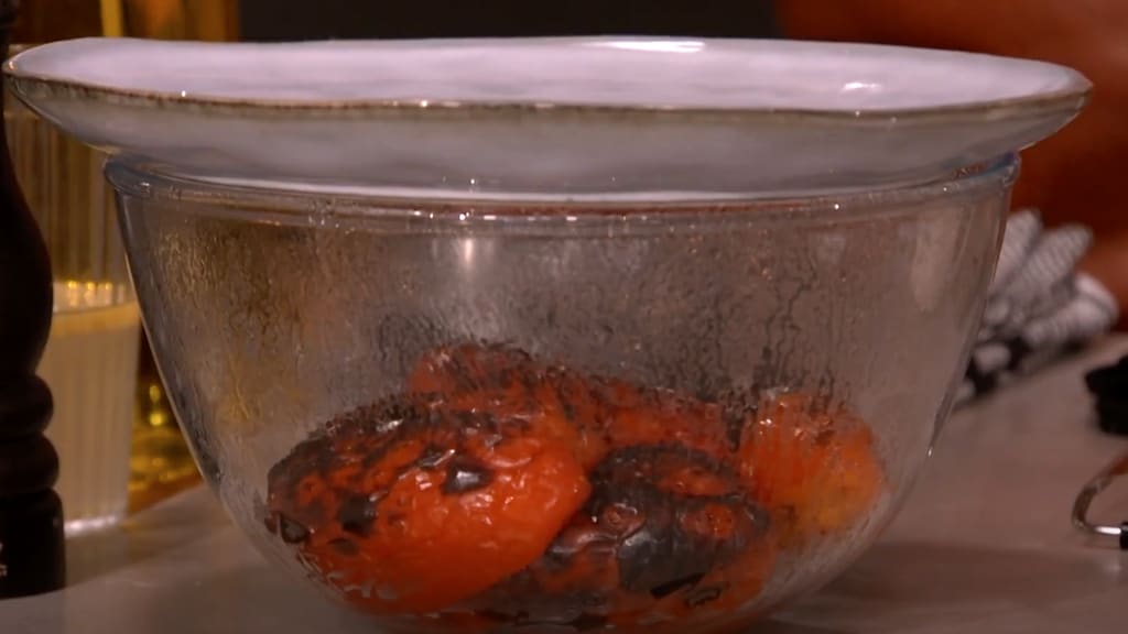 Stap 5: haal de paprika’s uit de oven en dek ze af met een bord, dit maakt het pellen ervan straks een stuk makkelijker. Laat ze 10 tot 15 minuten zo staan.