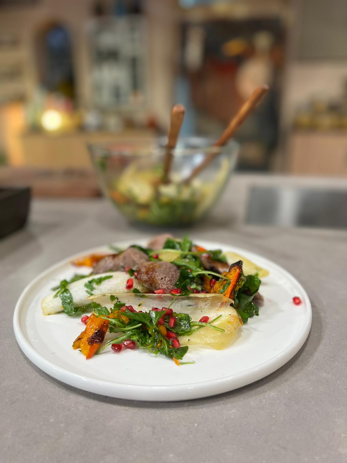 Geroosterde pompoensalade met witlof en worst