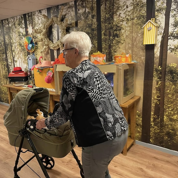Het verpleeghuis vindt het belangrijk zulke dingen voor de bewoners te faciliteren. Met de poppen bijvoorbeeld. "We hebben zelfs een aankleedtafel geregeld waarop ze heerlijk met de poppen bezig kunnen zijn", vertelt teammanager Tiecken. De bewoonster die niet met een rollator wil lopen, loopt wel graag met een kinderwagen. "Maar die is wankel en niet geschikt als loophulpmiddel."