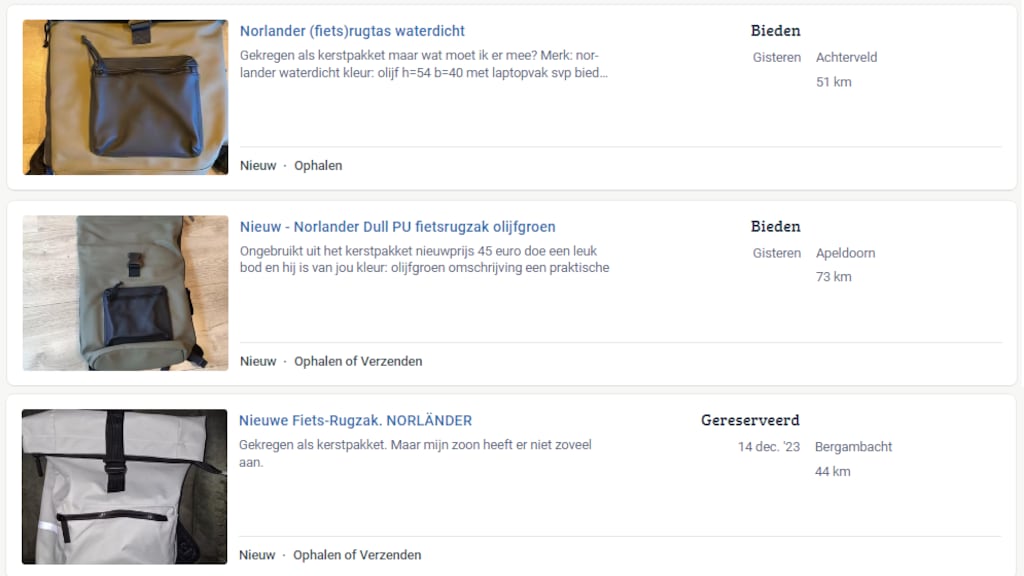 Ook de fietstas van het merk Norländer kwam, net als vorig jaar, weer veel voorbij in de Nederlandse kerstpakketten. Veel bedrijven kochten ook nu weer hun kerstpakketten in bij bedrijven die deze tas aanbieden in een niet-gepersonaliseerd kerstpakket. En ook dit jaar was niet iedereen daar even blij mee. Zo schrijft iemand uit Achterveld: "Gekregen als kerstpakket, maar wat moet ik ermee?" Je kan de tas overkopen door een bod te doen 'naar waarde'.