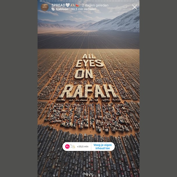 Talloze foto's zijn er van de gruwelijkheden in Gaza, maar juist een door AI gegenereerde afbeelding bereikt momenteel miljoenen mensen wereldwijd op sociale media. Het plaatje met de tekst 'All eyes on Rafah' wordt massaal gedeeld sinds de luchtaanval van Israël op die stad. De online demonstratie kán politieke druk uitoefenen, maar beïnvloedt vooral de publieke opinie.
