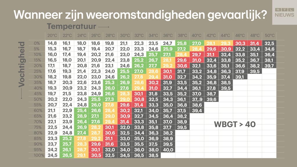 Maar hoe gevaarlijk is het nou? Om dat inzichtelijk te maken, wordt de term Wet Bulb Globe Temperature gebruikt. De tabel die daarbij hoort, zie je hieronder. Een hoge temperatuur in combinatie met een hoge luchtvochtigheid zorgt voor de hoogste waarden.