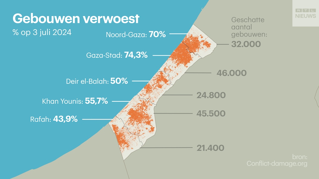 Hoe groot de ravage inmiddels is, kan worden opgemaakt met behulp van satellietgegevens. Die tonen aan dat sinds de Hamas-aanslagen van 7 oktober waarschijnlijk 59 procent van alle gebouwen in Gazastrook beschadigd is geraakt of zelfs volledig is verwoest. In de zuidelijke stad Rafah, volgens Israël het laatste bolwerk van Hamas, heeft bijna 44 procent van de gebouwen schade.